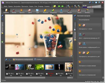 Helicon Filter – программа, рассчитанная на пошаговое редактирование фотографий. Имеет интуитивно понятный интерфейс, обеспечивающий удобство работы с программой даже для неопытных пользователей. Некоторые из самых интересных и уникальных особенностей: Уникальный механизм выделения объектов (кисть выделения) Фильтрация пыли на сенсоре Компенсация дымки Регулирование спектральной чувствительности применяемых фильтров Фильтр хроматической аберрации Виньетирование Уникальные инструменты коррекции шума, яркости, цвета, ретуши Управление файлами: Автоматическое создание к