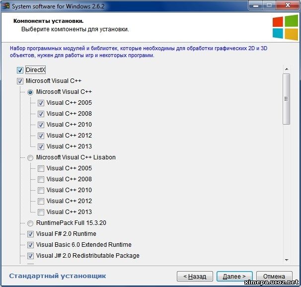 Состав набора: -DirectX (полная версия) -Microsoft Visual С++ (2005-2008-2010-2012-2013 x86 и x64 + Visual Studio 2010 F# Runtime 2.0 + Visual Basic 6.0 Extended Runtime + Visual J# 2.0 Redistributable Package + Visual Basic 7 Runtime) -Microsoft Visual C++ 2005-2008-2010-2012-2013 Redistributable Package от Lisabon -NET Framework Version 1.0 SP2 для Windows XP -NET Framework Version 1.1 SP1 -NET Framework Version 3.5 SP1 -NET Framework Version 3.5 (для Windows 8 и 8.1) -NET Framework Version 4.0 (для Windows XP и Server 2003) -NET Framework Version 4.6 RC -Windows Media Video 9 VCM -OpenAL 2.1.0 -Rapture3D 2.6.5 -NVIDIA PhysX 9.14.0702 -NVIDIA PhysX Legacy 9.13.0604 -NVIDIA PhysX Legacy Full by CUTA -RuntimePack Lite 15.3.20 -RuntimePack Full 15.3.20 -Games for Windows - LIVE 3.5.95.0 Final -Java Platform SE 7 U76 -Java Platform SE 8 U40 -Java Platform от Lisabon SE JDK JRE v7&8 -Adobe Flash Player 17.0.0.134 для Internet Explorer -Adobe Flash Player 17.0.0.134 для Firefox и Netscape -Adobe Flash Player 17.0.0.134 для Opera и Chrome -Аддон Adobe Shockwave Player 12.1.7.157 -Adobe AIR 17.0.0.124 -Microsoft Silverlight 5.1.31211.0 -Microsoft XNA Framework Redistributable 3.1 -Microsoft XNA Framework Redistributable 4.0 -Microsoft XML v4.0 SP3 -Microsoft XML v6.0 SP1 -Windows Media Player Firefox Plugin 1.0.0.8 -Unity Web Player 5.0.0.0 -Social Club 1.1.0.6 -Uplay 5.1.0.3929 -Origin 9.5.5.2850 -Steam Client 2.10.91.91 -Windows Imaging 1.0 (для Windows XP и Server 2003) -Indeo Codecs 5.11